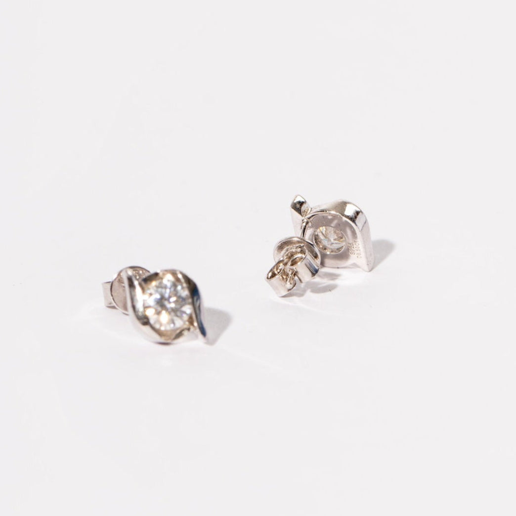 Brilliant cut 5mm wide (0.5 carat) round man made diamond gemstones, tension set and framed by thick modern swirls of pure sterling silver.