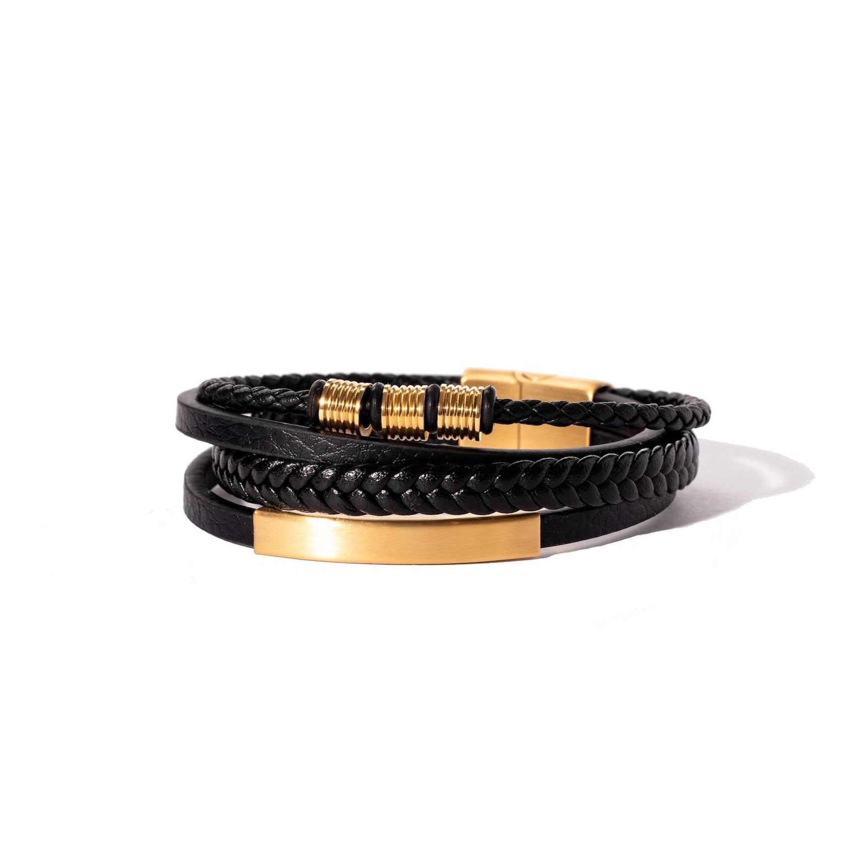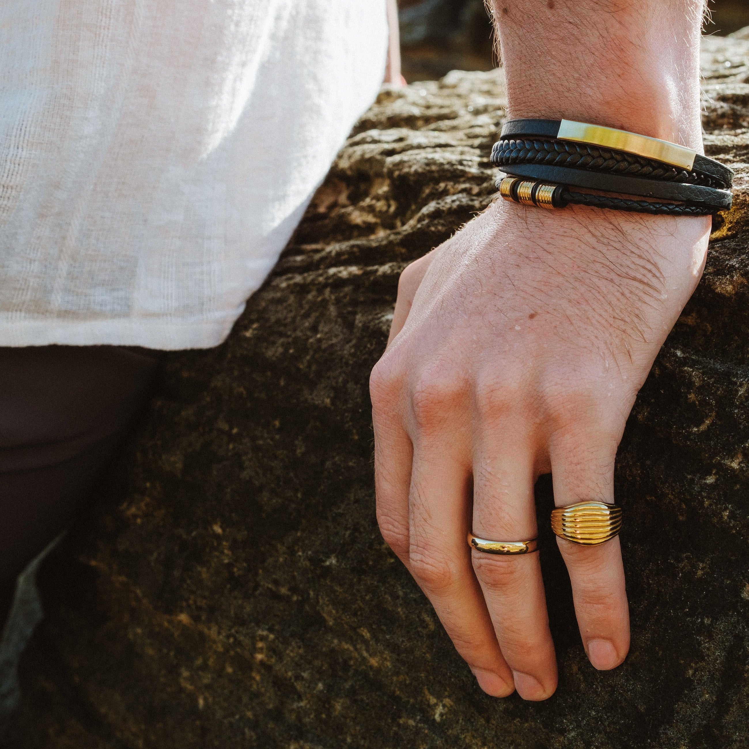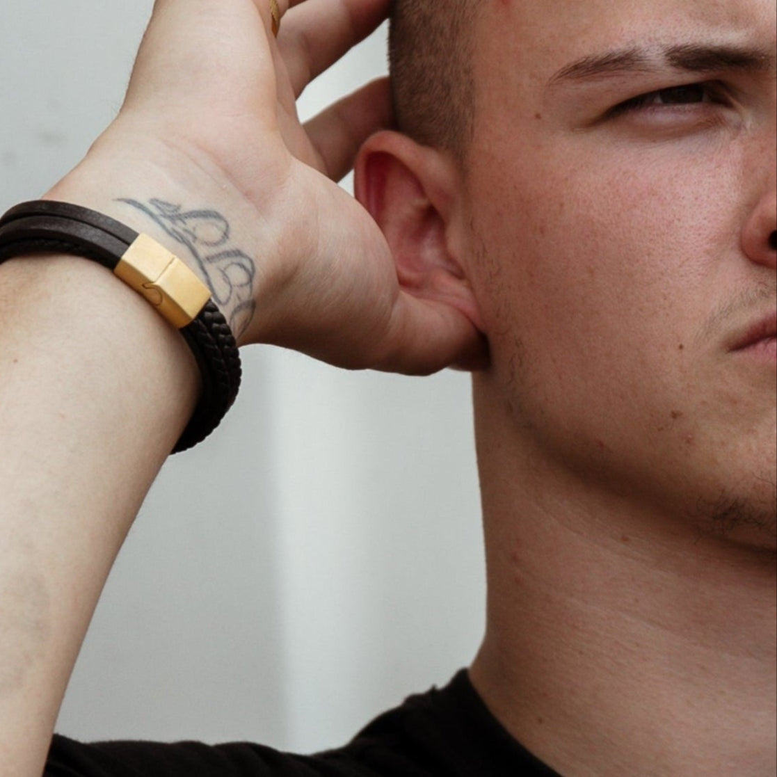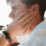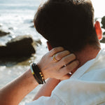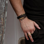 Our men's bracelet was designed with surf, sun and social events in mind. Easy to wear with pusher clasp that you pull up to release and slide down to secure. A perfect component to your casual and smart casual outfits. All gold elements can be slid along the leather to change up its look too. Looks amazing paired with any of our waterproof mens rings too!
