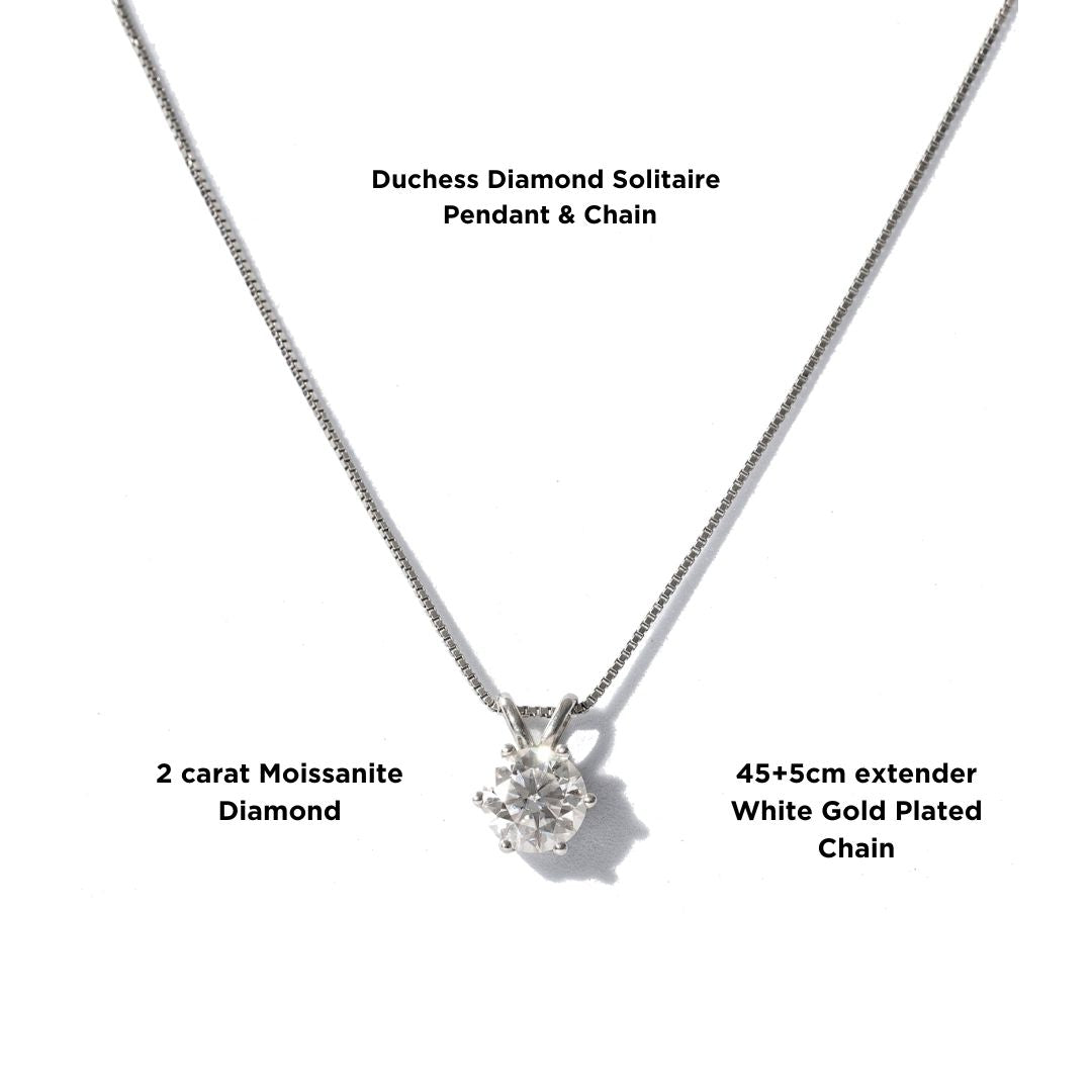 A stunning two carat man made diamond pendant set in pure silver and with pure silver chain. Waterproof, tarnish proof, every day glamour.