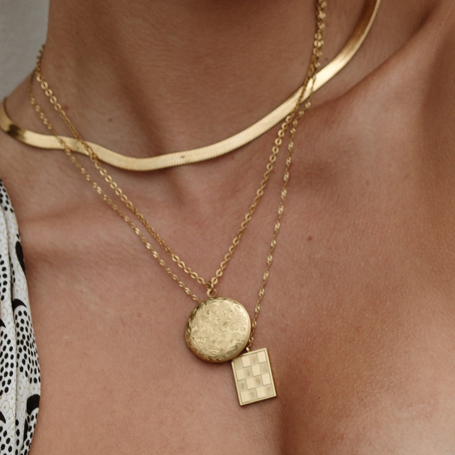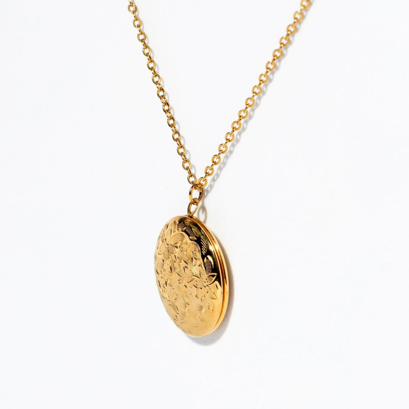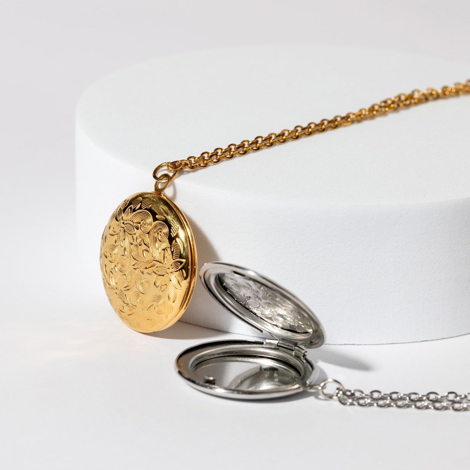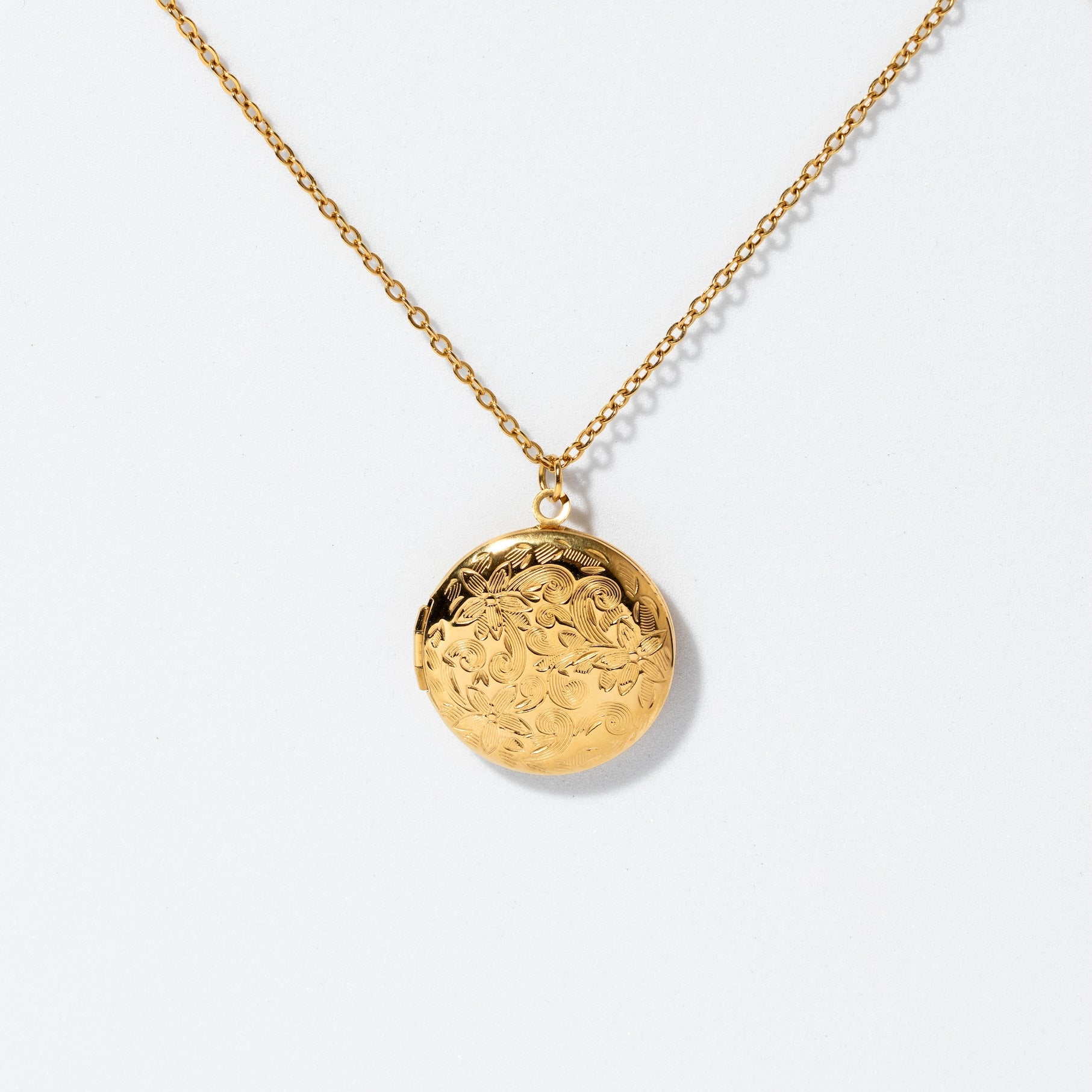 The length of the chain is 18 inches (just under 46 cm's) with a free 2 inch extender already attached so you can wear at multiple lengths to suit your mood. The gorgeous locket etched with Broderie Anglaise style markings, measures 3.1cm's x 2.6cm's. It is a functional locket that opens and closes, so that you may keep a locket of hair, an image or other special keepsake. It has been laser engraved and polished by hand. This pieces weighs 7 grams in total, making it comfortable to wear all day, every day. 18K Genuine Gold coated that is permanent due to our innovative and unique manufacturing. Waterproof, tarnish proof, forever jewellery. Luxury for less for you or your loved one. Also available in Silver.