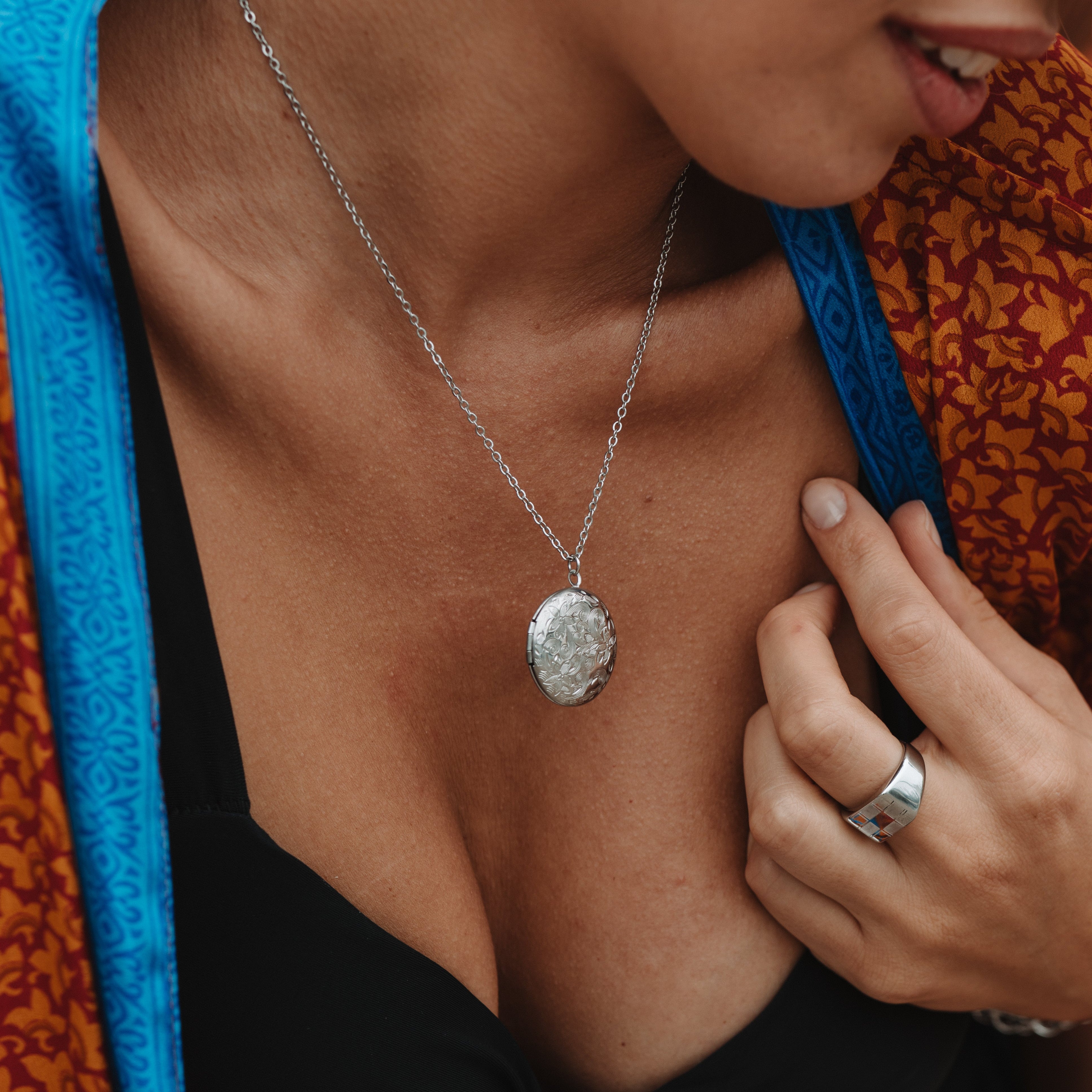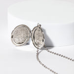 This elegant silver locket and chain, crafted from premium stainless steel, offer timeless charm and versatility. The chain measures 18 inches (just under 46 cm) and includes a 2-inch extender, allowing you to wear it at various lengths to suit any mood or outfit. The locket, etched with delicate Broderie Anglaise-inspired patterns, measures 3.1 cm x 2.6 cm and opens to hold a cherished keepsake, such as a photo or lock of hair. Each piece is laser-engraved and polished by hand, weighing only 7 grams for comfortable, all-day wear. Made from high-quality, waterproof, and tarnish-proof stainless steel, this piece promises lasting durability and beauty. A luxurious yet affordable choice for yourself or a loved one, this is truly “forever" jewellery.