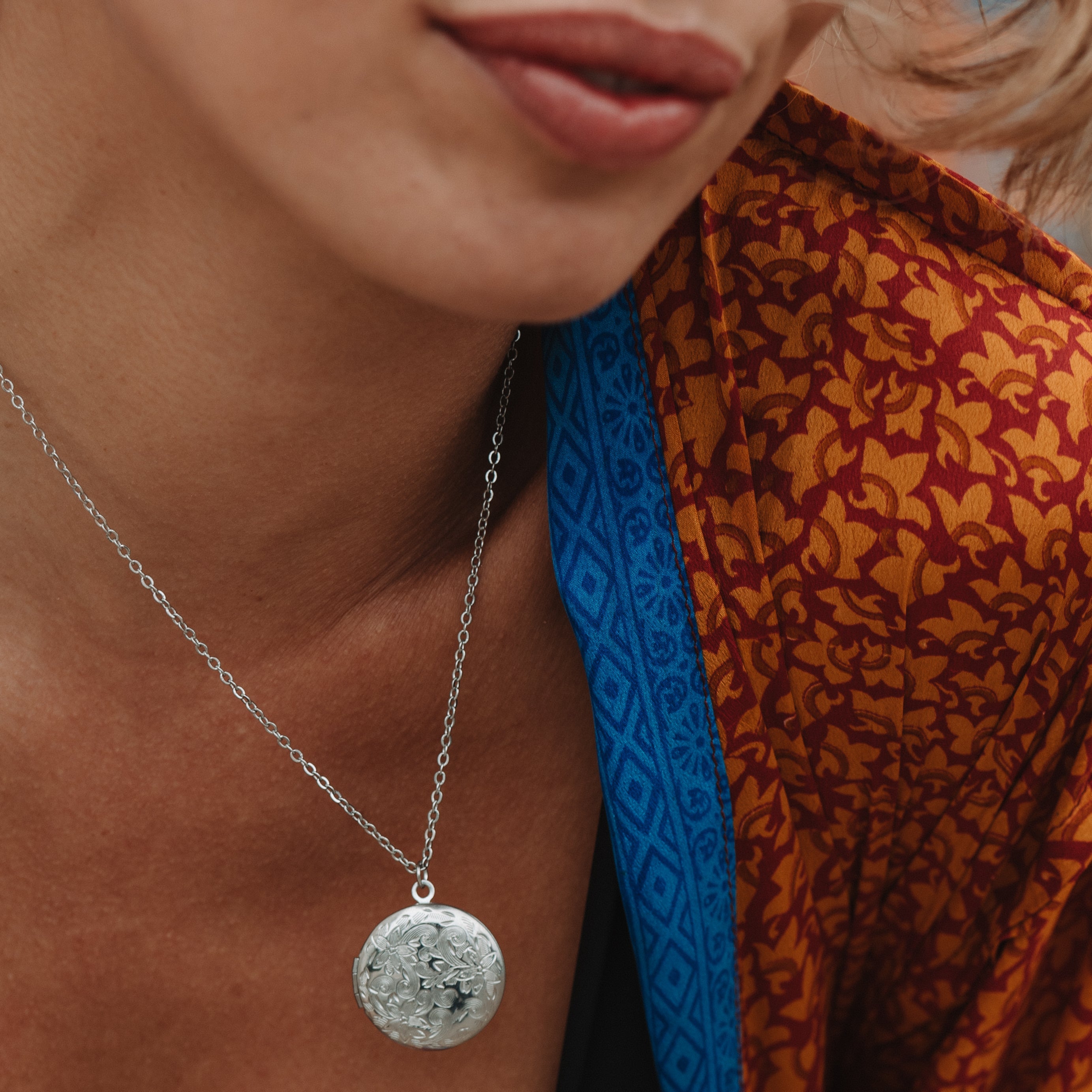 This silver locket and chain bring an antique touch to any look, with delicately engraved motifs that reflect the artistry of Edwardian craftsmanship.