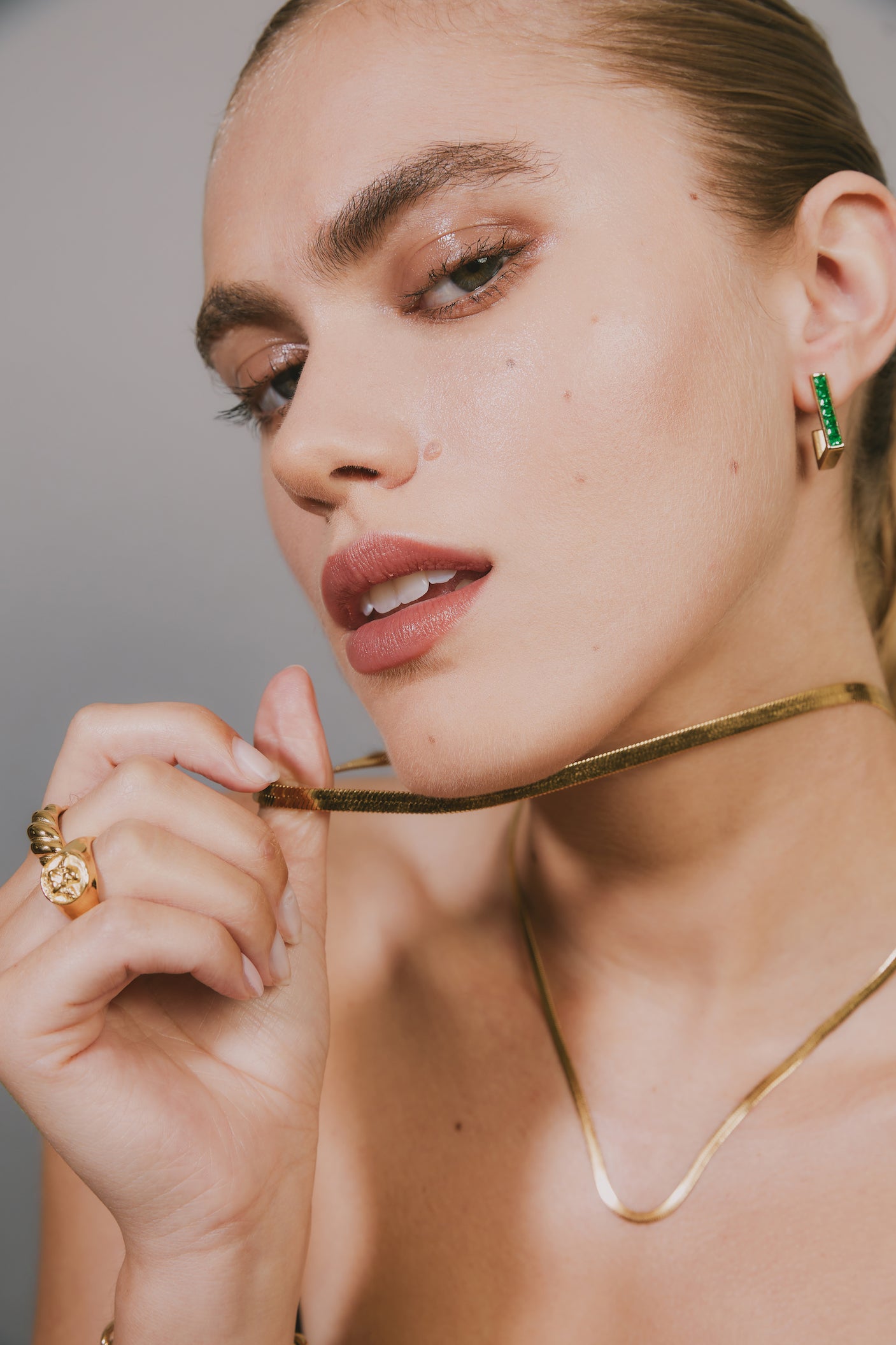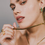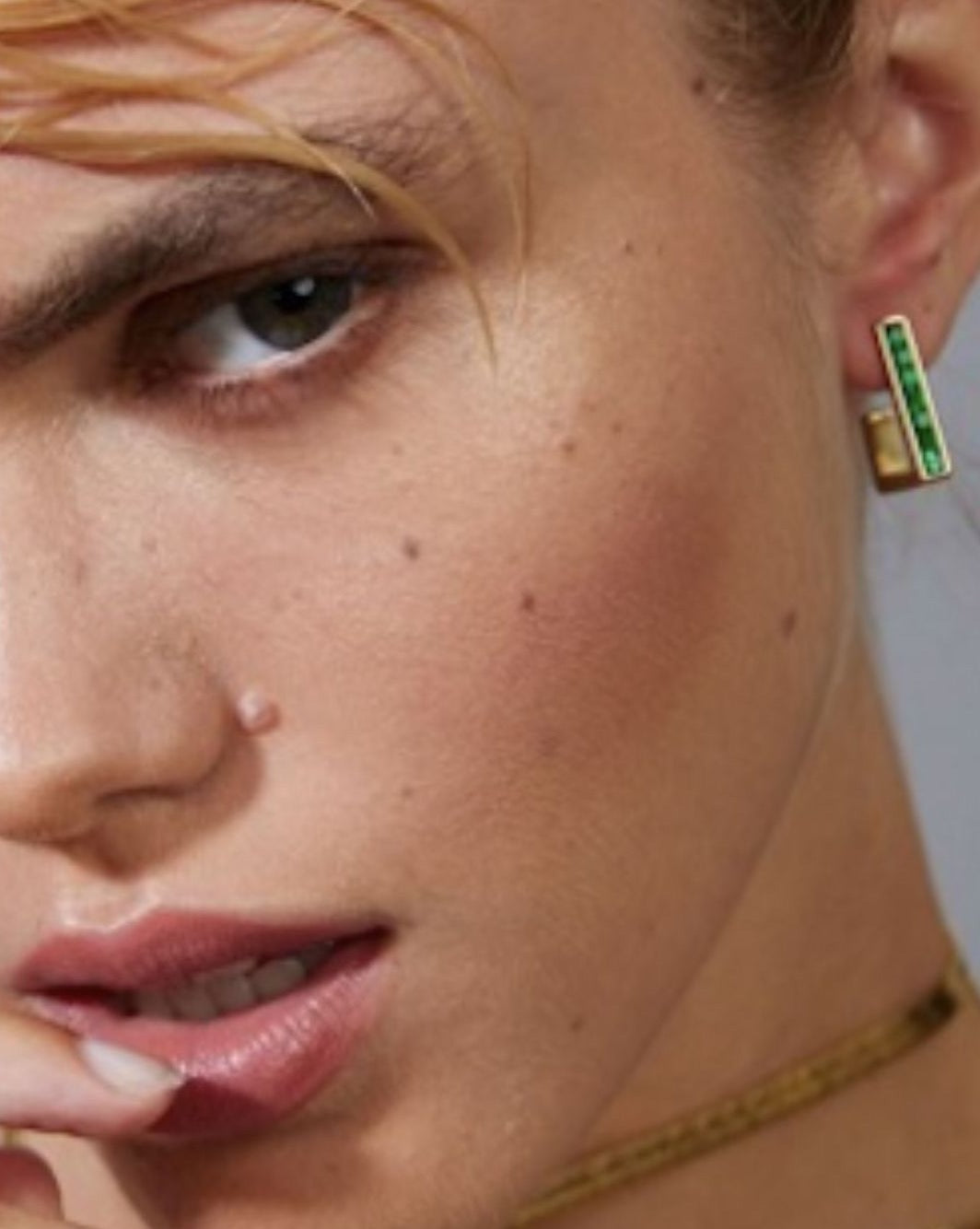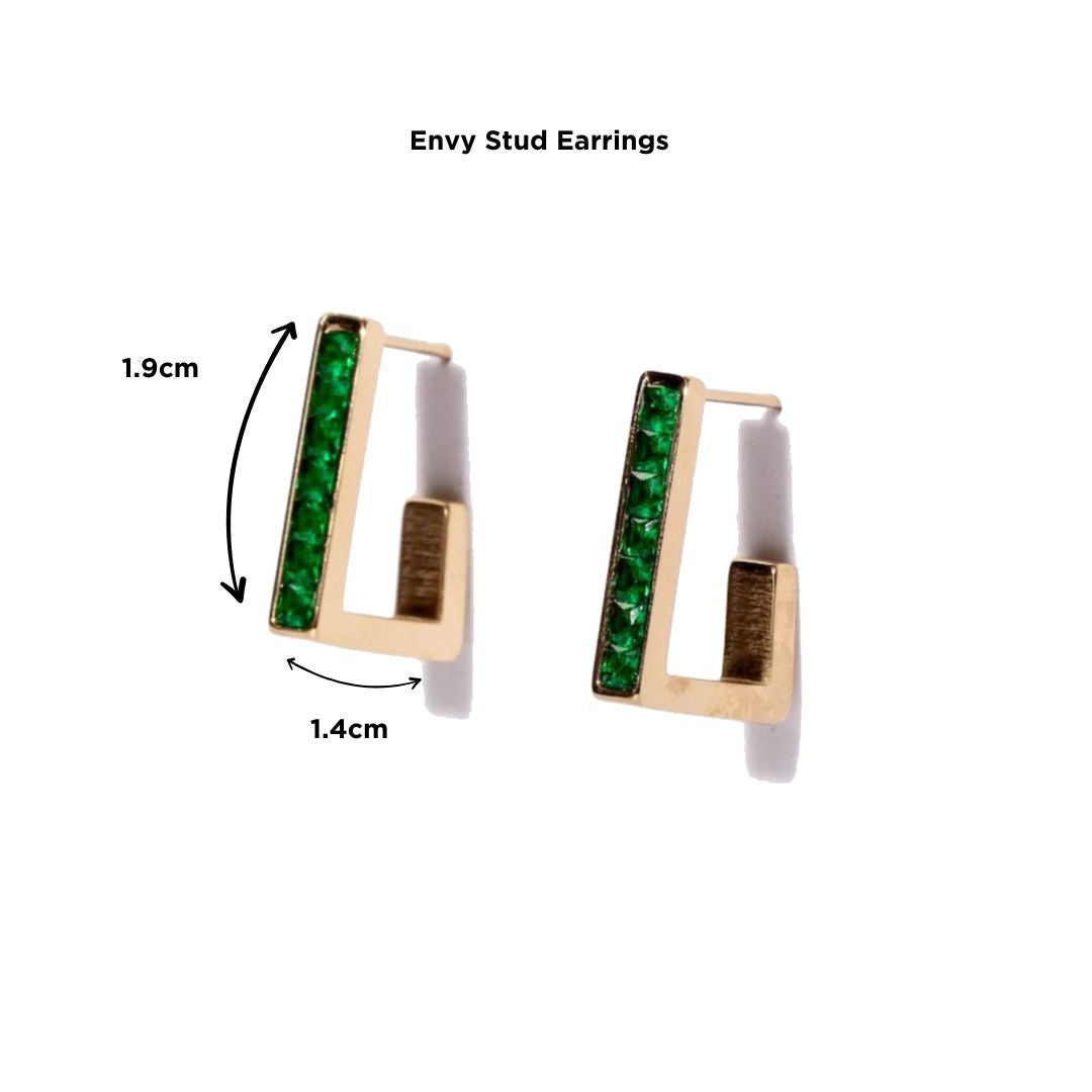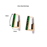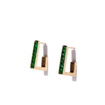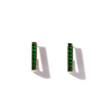 2cm from top to bottom in laid with man made emerald green gems that are 3mm wide, channel set and reflect the light with a glamorous shimmer. Set in 18k Gold Permanent coating. Waterproof, Tarnish Proof and Allergy Safe. The return is 8mm with a kick up of 4mm, making an open square. Post and stud clasp for comfortable secure all day or all night wear. Available in Caviar Black, Envy Emerald Green and Ice White.