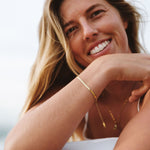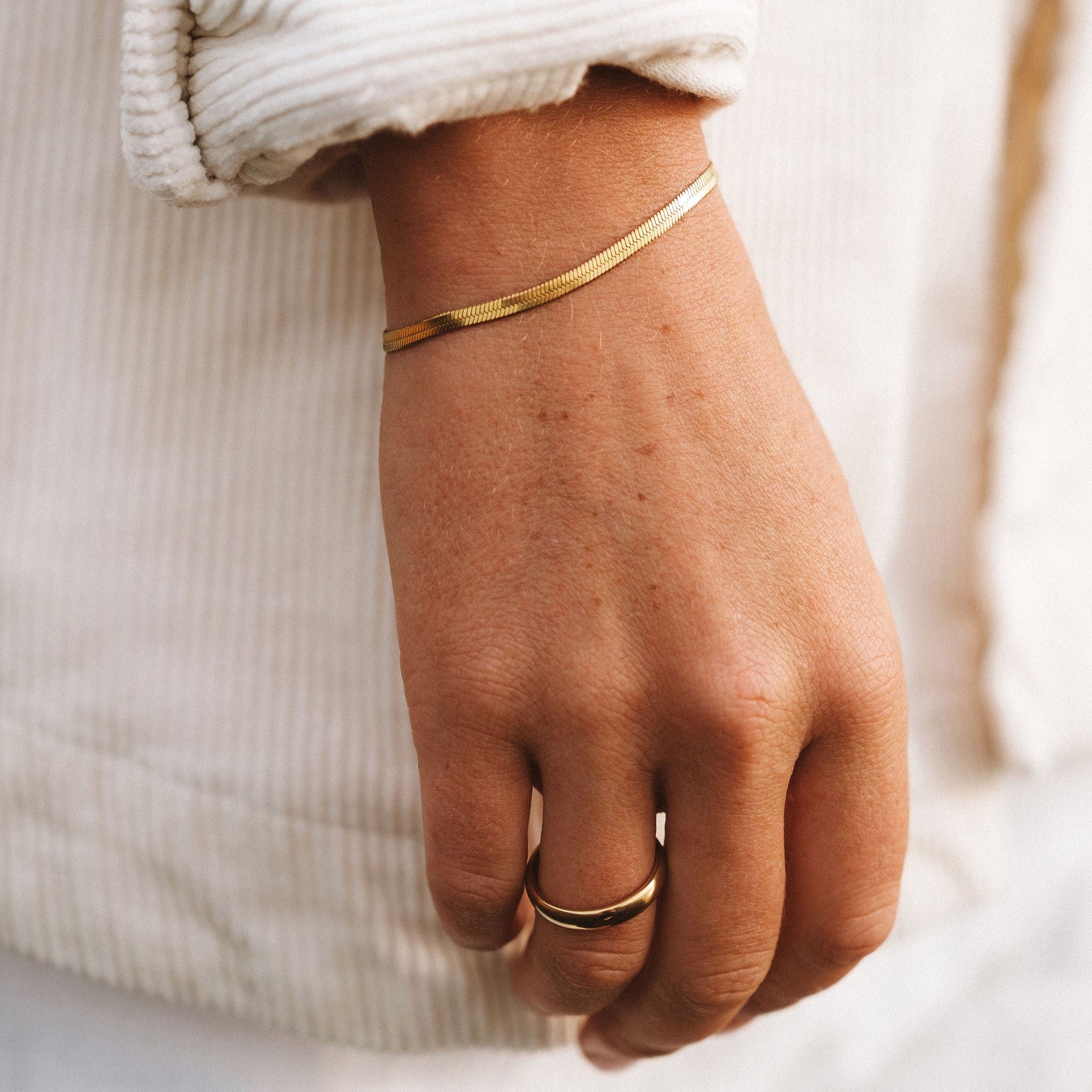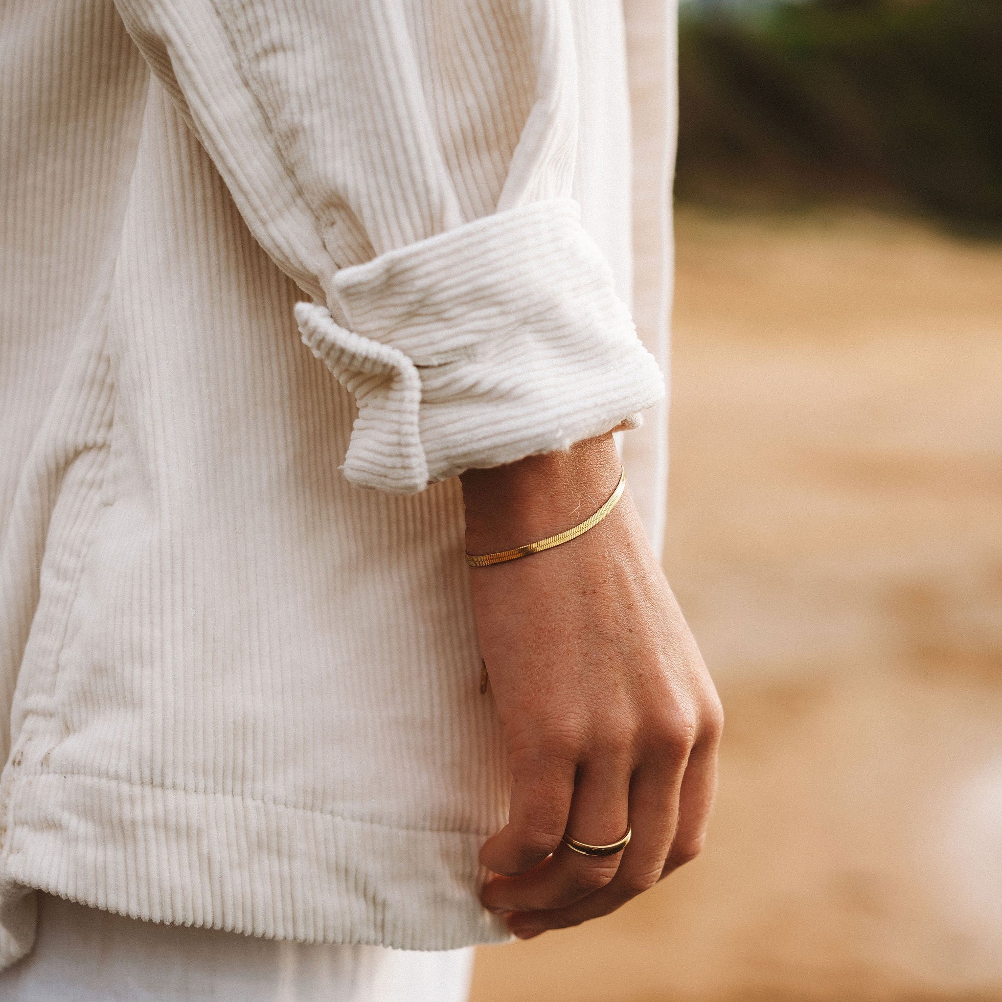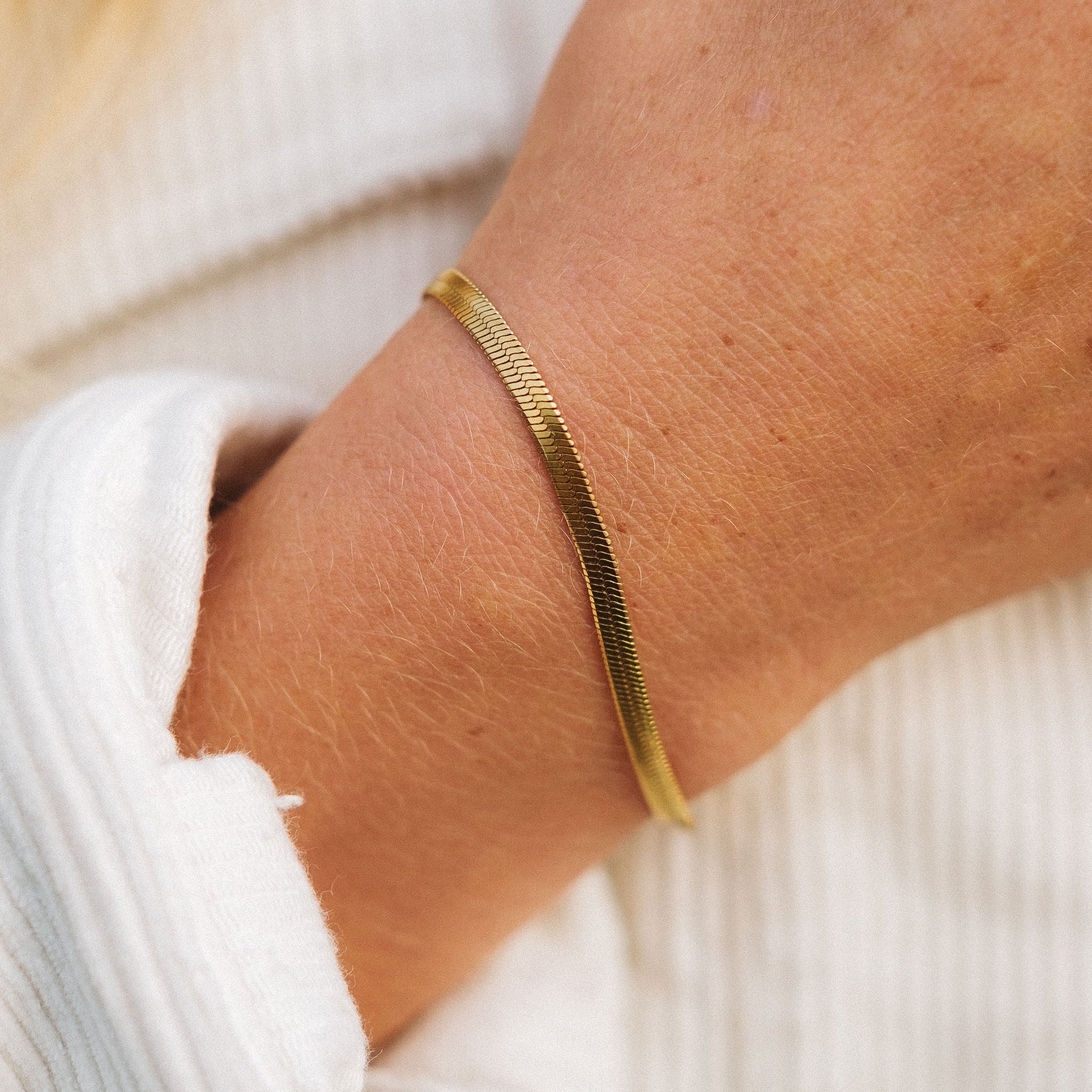 The Gilda bracelet matches the Gilda Necklace. They are both herringbone designed and sit flat and silky on the skin. A sellout favourite and suits any taste and style.