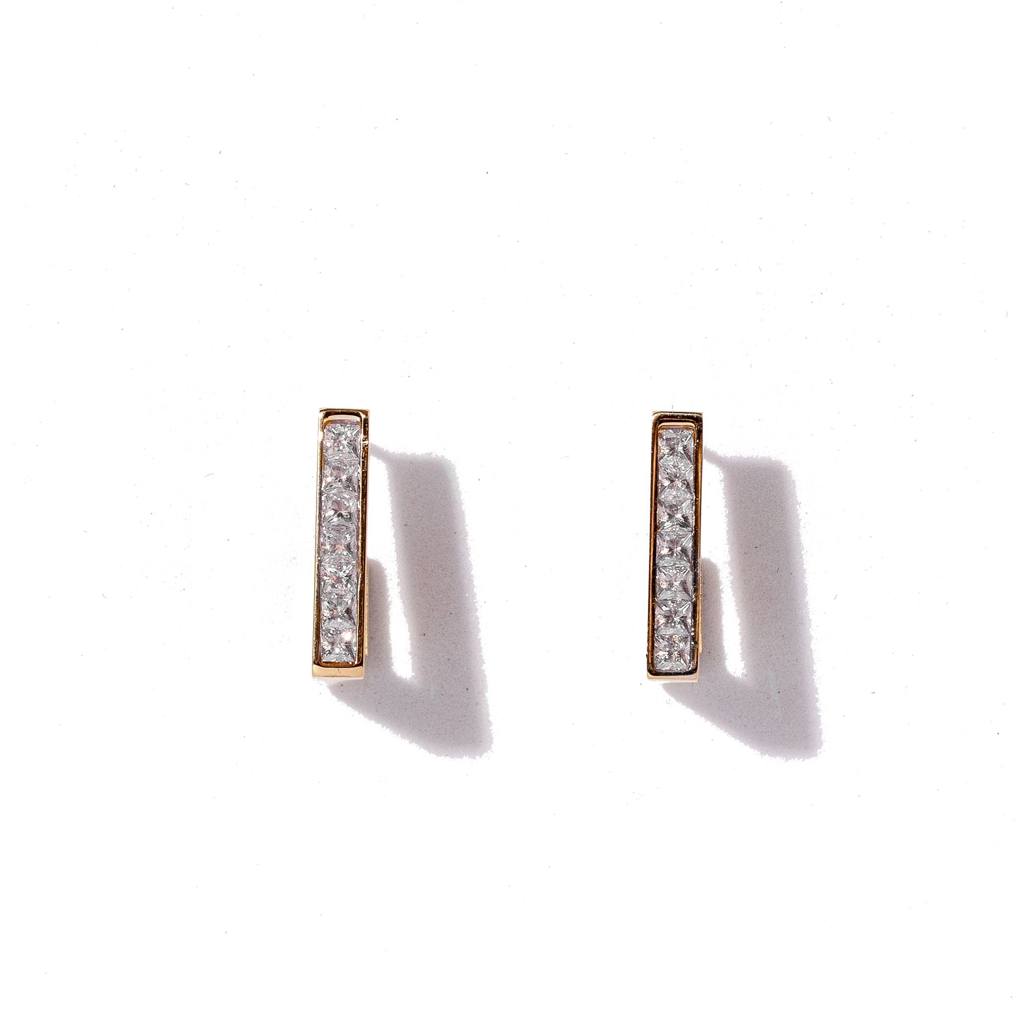 2cm from top to bottom in laid with high quality gemstones that are 3mm wide, channel set and reflect the light with a glamorous shimmer. Set in 18k Gold Permanent coating. Waterproof, Tarnish Proof and Allergy Safe. The return is 8mm with a kick up of 4mm, making an open square. Post and stud clasp for comfortable secure all day or all night wear. Available in Caviar Black, Envy Emerald Green and Ice White.