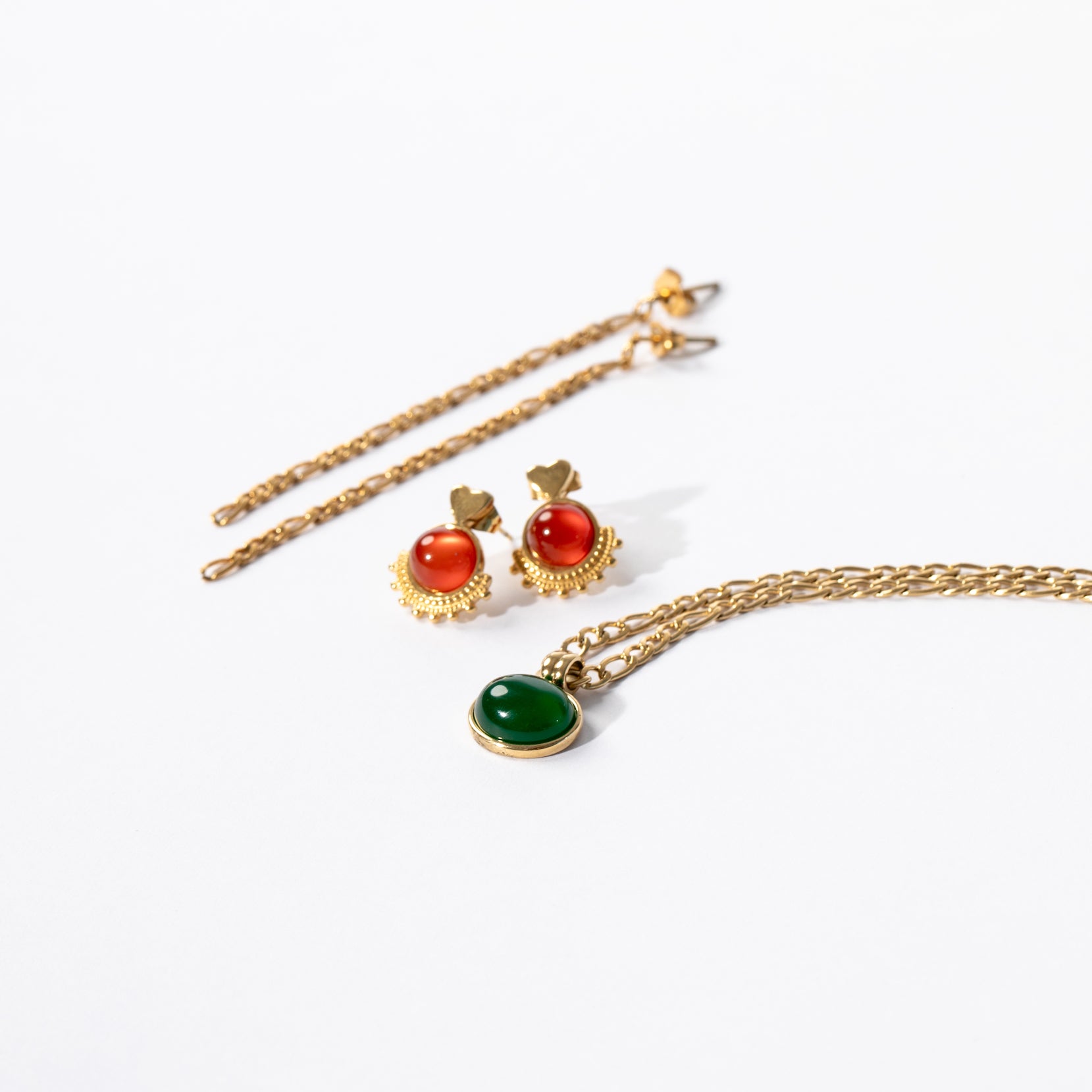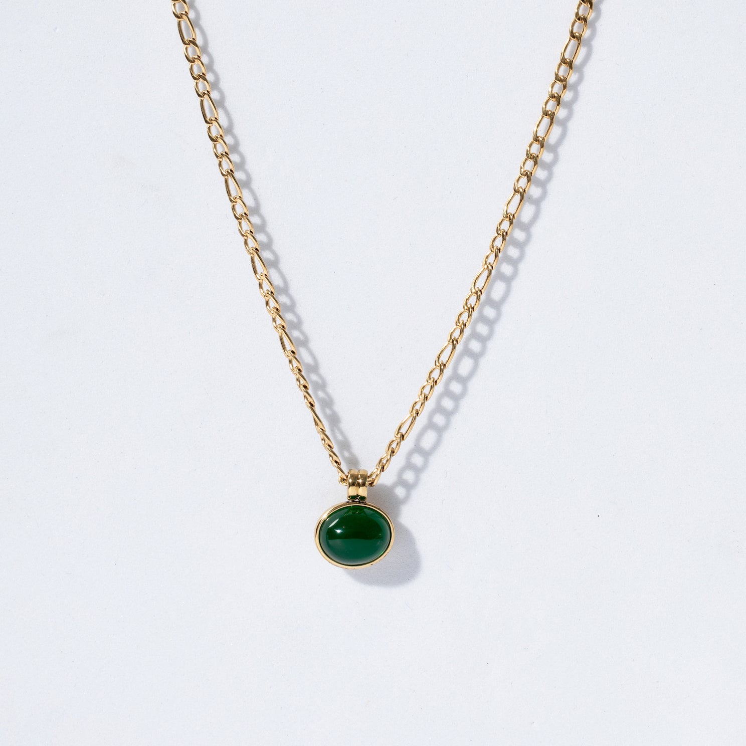 A gorgeous eye shaped Jade coloured gem set in gold on a stylish open link chain. Available in Dark Green, Light Green and Aqua.