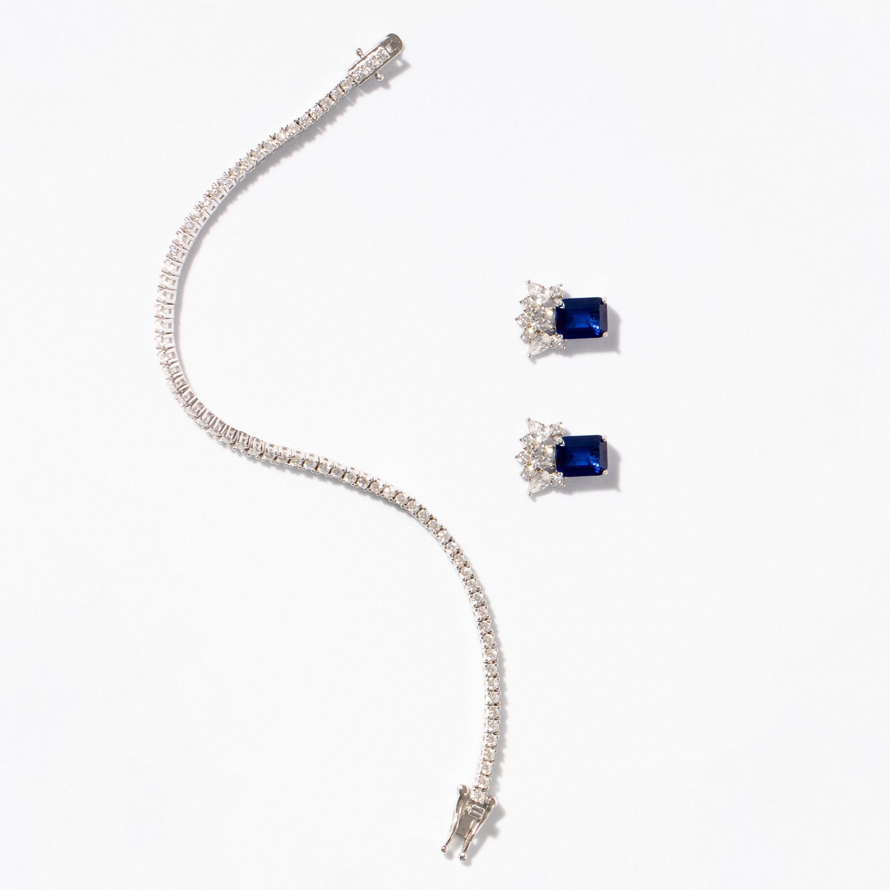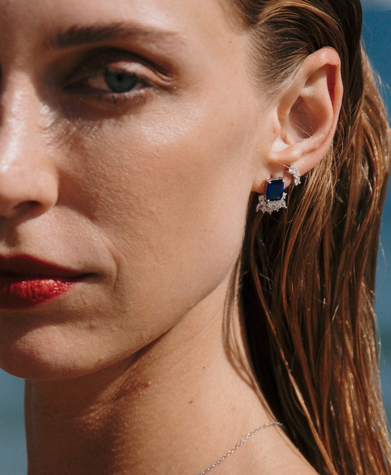 Made from sterling silver, these exquisite man made sapphire pieces embody the essence of intelligence and wisdom. Measuring 10mm in height and 5mm in width. Sapphires are revered not only for their striking beauty but also for their symbolism. These lovelies are presented on a bed of eight man made diamond gems. A perfect choice for those who seek both sophistication and deeper meaning in their jewellery.