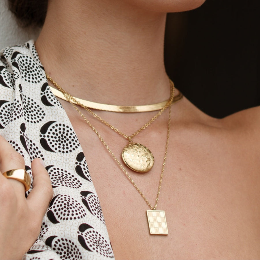 This prestige pendant has etched squares giving it a cool and intriguing look. Is it a chessboard, is it scrabble, is it a cross is it dice. You decide! The perfect piece for minimalistic chic. It sits flat against the skin for all day and night comfort while it glints every time you move. The pendant comes with a lavish twist chain that is 51cm's in length + extender. All made with our unique permanently coated genuine 18K gold that is waterproof, tarnish proof and allergy safe. The perfect match for our Vintage Signet Rings too. Shop now to get the set.